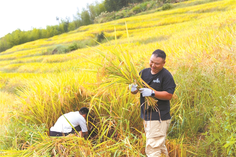 10月中旬,熙岭乡四坪村的食光梯田迎来丰收季。沉甸甸的水稻颗粒饱满,田中稻花鱼游弋不时泛起涟漪,构成一幅“稻鱼共生”的生态图景。