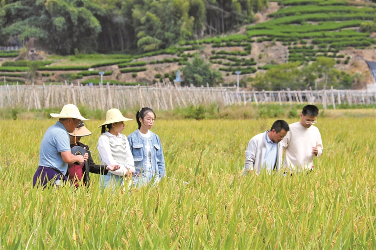 金秋时节,在福鼎市太姥山镇才堡村的优质稻新品种展示示范田里,稻浪翻滚、金穗飘香,甬优106、浙杭优220等新品种迎来丰收季。田垄间,农技专家、种粮大户穿梭其中,逐一观察不同品种晚稻的长势(上图)。
