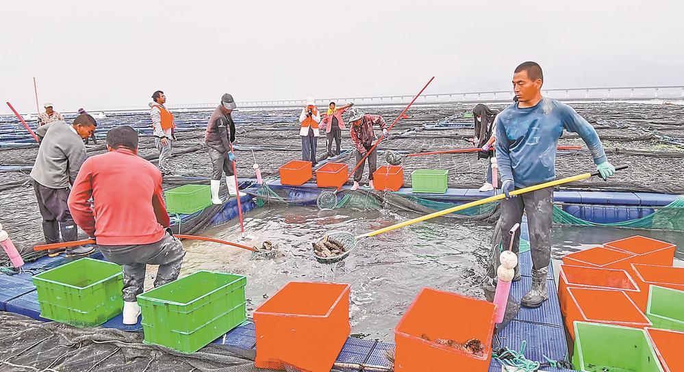 在基地养殖队队长林建俊的带领下,数十名养殖工人熟练地用长竿网兜从网箱中打捞海参。一只只肥硕饱满的海参接连出水,经过冲洗、过秤、装筐后,再被搬运到早已等候多时的外运渔船上,发往临近的后江码头。