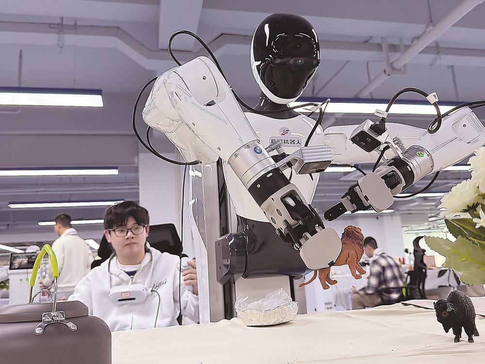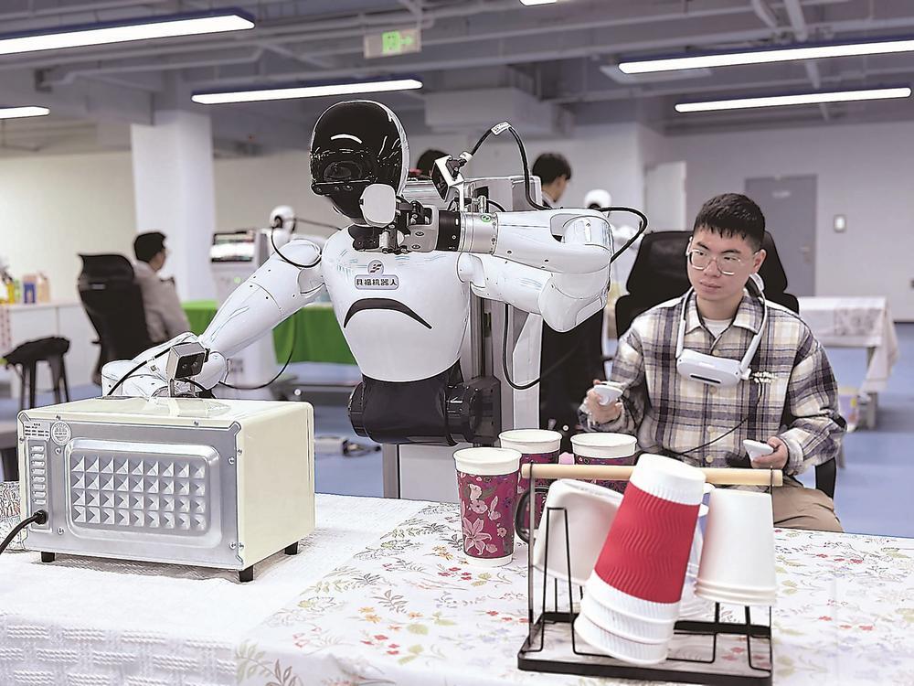 图为信息采集员正在训练具身机器人。
