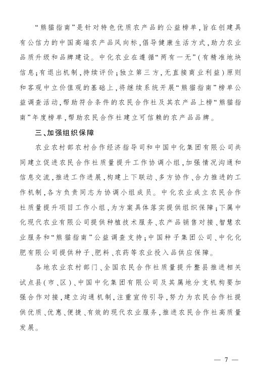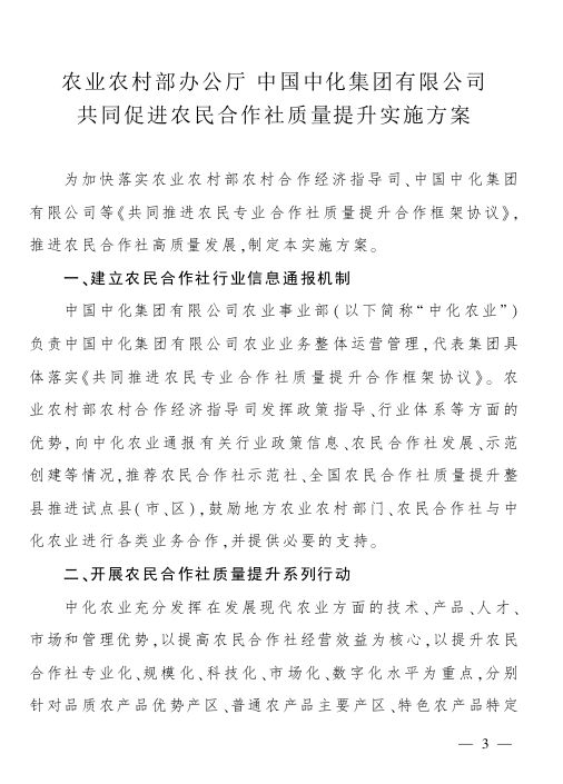 为推进农民合作社高质量发展,我部会同中国中化集团有限公司联合制定了《农业农村部办公厅中国中化集团有限公司共同促进农民合作社质量提升实施方案》(附后),发挥双方各自优势,为农民合作社提供服务。现印发给你们,请结合工作实际,认真贯彻落实。