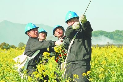 近日,浦城县濠村乡樟源村源头自然村10千伏濠莫线源头支线50号至56号杆的施工现场,十几名浦城县供电公司员工在紧张有序架设线路。