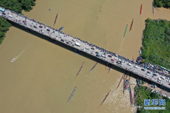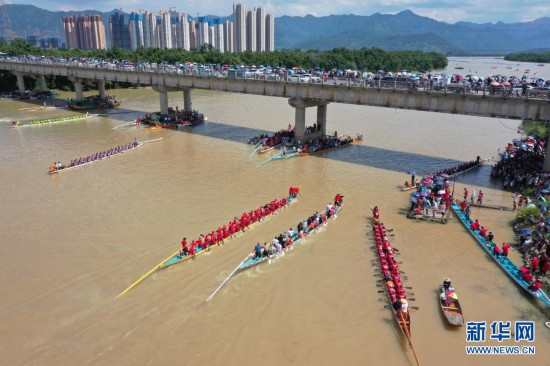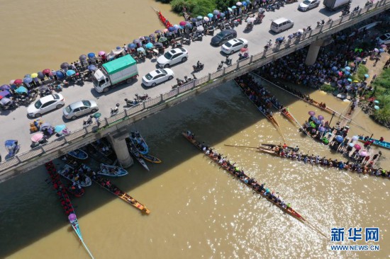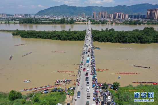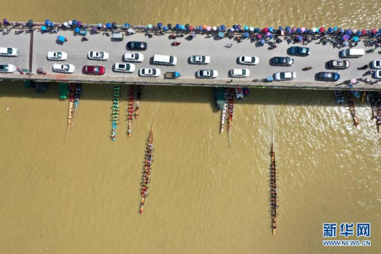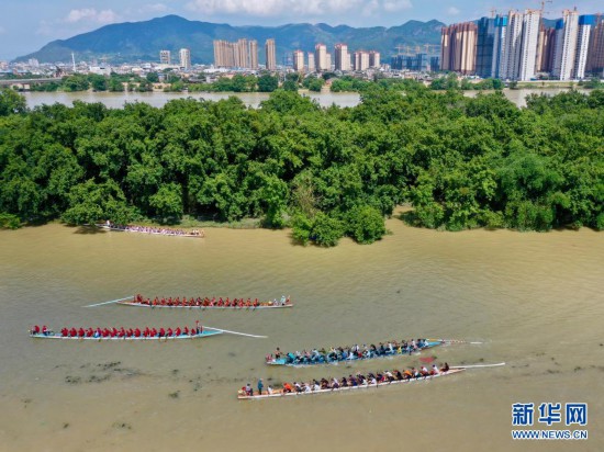 6月13日,在福州市闽侯县大樟溪南港段,民间龙舟竞渡迎端午(无人机照片)。