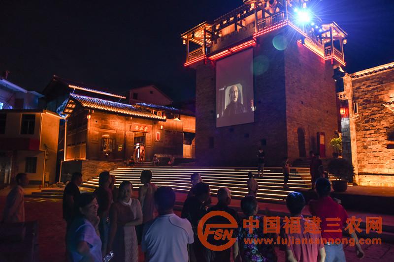 在南平市建阳区书坊乡烽火炮楼露天影院正播放红色电影,不少村民和游客驻足观看。 黄杰敏 摄