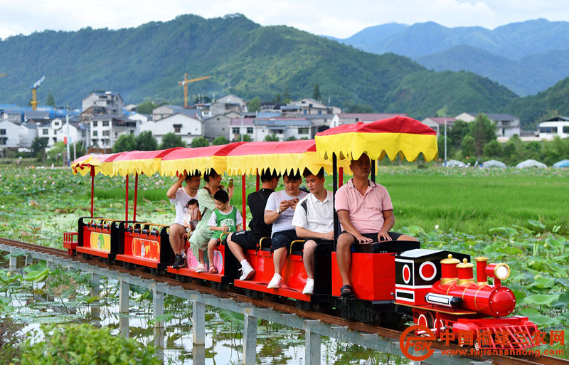 游人乘坐小火车在武夷山市五夫镇万亩荷塘观赏荷花