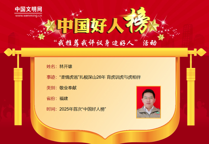林开雄,男,1969年5月生,中共党员,福建梅花山华南虎繁育研究所所长。林开雄26年扎根深山,非凡执着坚守,九千多个日夜,迎来虎啸山林。从风华正茂到两鬓斑白,“柔情虎爸”写就人虎相伴动人故事。他倾注真情于饲养繁育工作,确保幼虎高成活率,并探索出有效的野化训练方法。林开雄曾获“感动福建”十大人物、“福建好人”等荣誉。