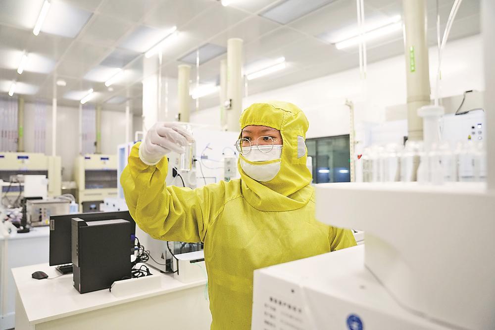 24日,位于上杭蛟洋新材料产业园的福建天甫电子材料有限公司的电子实验室里,技术人员正进行实验操作与数据分析。目前,该公司正开足马力全力冲刺一季度“开门稳”“开门红”。李新元 林燕萍 摄