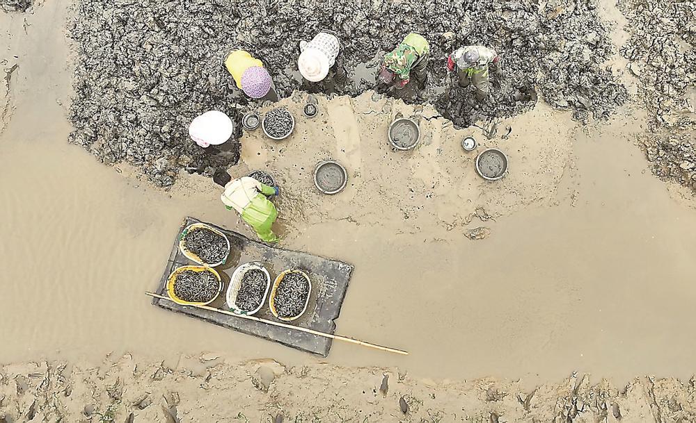 眼下正值海蛏春收旺季,在位于福清市海口镇的福清台湾农民创业园三华园区,几十名工人手持蛏刀、身穿水衣胶鞋,将一只只肥美的海蛏从蛏田里挖出。