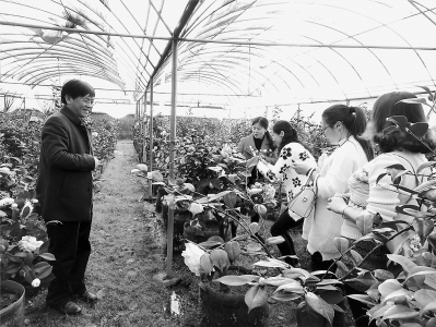 天宝花卉家庭农场的茶花竞相怒放,吸引了许多游客前来观赏拍照。