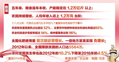 五年来,粮食连年丰收,产能稳定在1.2万亿斤以上;肉、禽、蛋、奶、水产品供给充足,百姓舌尖安全更加保障有力;“化肥农药零增长”行动成绩斐然,去年全国化肥使用量首次接近零增长;农民持续增收,人均年收入迈上1.2万元台阶;农业现代化水平大幅提高,靠天吃饭成为历史;农村新产业新业态蓬勃发展,广袤田野迸发出前所未有的活力。