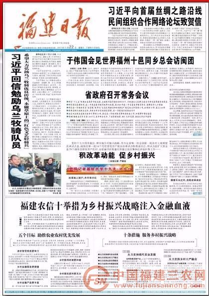11月22日,《福建日报》头版刊登了《福建农信十举措为乡村振兴战略注入金融血液》。现将《福建日报》刊发全文转载如下:
