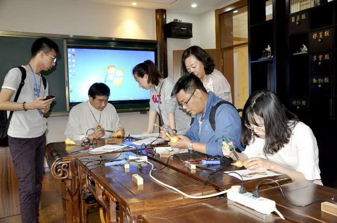 “张老师,这个图案应该怎么剪呀?”“我剪得对吗?”“太神奇了,这一张纸经过剪裁就变成了这么美丽的图案,太棒了!”“这个脸谱是哪个京剧人物的呀?”“电烙铁要多热才能形成这个图案呀?”“我这一招式对吗?”“古琴弹起来可真难呀!”“老师您弹得可真好听!”每一个体验活动都让来宾们兴趣盎然,大呼过瘾。