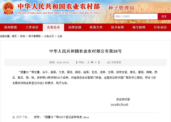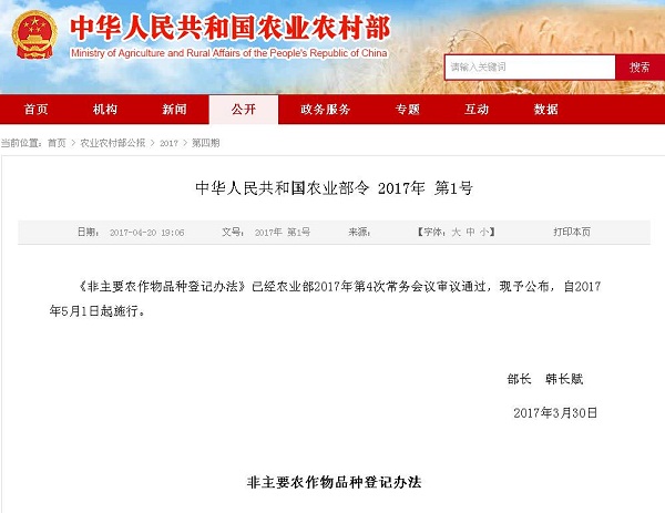 2017年5月1日,《非主要农作物品种登记办法》经农业部2017年第4次常务会议审议通过,正式施行。《登记办法》明确,非主要农作物(即稻、小麦、玉米、棉花、大豆五种主要农作物以外的其他农作物),在推广前应当登记。应当登记的品种未经登记的,不得发布广告、推广,不得以登记品种的名义销售。