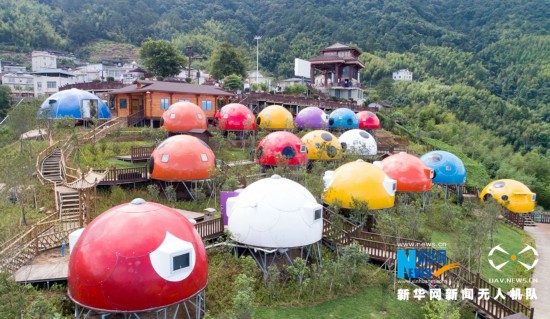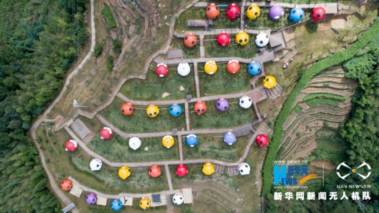 在官畲村,“小瓢虫”民宿群带给游客独特的住宿体验,这个民宿群周边是农田和山林,此间有栈道相连,成为游客观光的一处景点(无人机拍摄)。新华网 肖和勇 摄