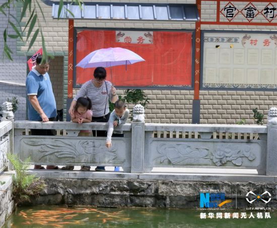在官畲村,游客带着孩子在一处池塘观赏金鱼。夏季,当地不少游客到这里享受清凉。新华网 肖和勇 摄