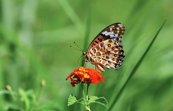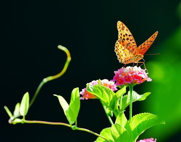 福建省福州市温泉公园内,一只蝴蝶停歇在马缨丹花枝头上采蜜(8月11日摄)。