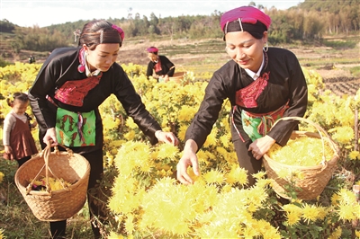 11月8日,霞浦县水门畲族乡畲家农户在采摘金丝黄菊。近年来,该乡大力发展现代观光农业产业,先后引进百瑞坊生物动力农场等多家现代农业企业,发展现代观光农业种养业,为拓宽当地农户增收渠道,助推山区贫困群众脱贫致富,起到了重要作用。 夏斌 摄