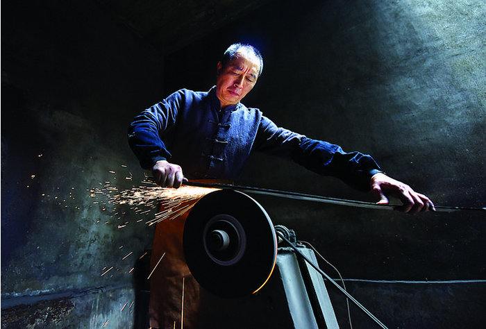 范志华正在查看铸造中的剑身,经过无数次磨砺使宝剑寒光逼人。