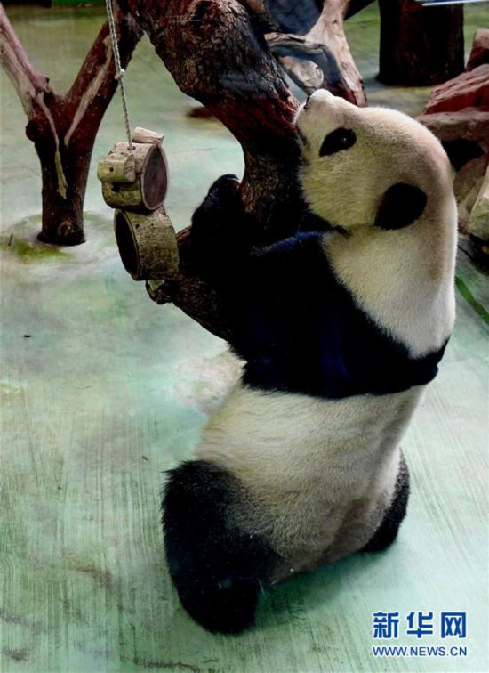 大熊猫“圆圆”在台北动物园熊猫馆玩耍(4月28日摄)。新华社 张国俊 摄