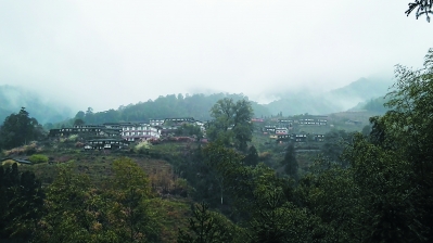 欣赏这座村落,如在欣赏一幅淡淡的山水画。村落依着翠绿的山峦,云雾缭绕;畔着梯田,一层一层的,从村落延向山脚。春寒料峭,田虽然还荒芜着,却也见层层青绿,其间还有霜冻后枯黄的芦苇。村落就是这样依着山畔着田,在云雾之中犹抱琵琶半遮面,朦朦胧胧。