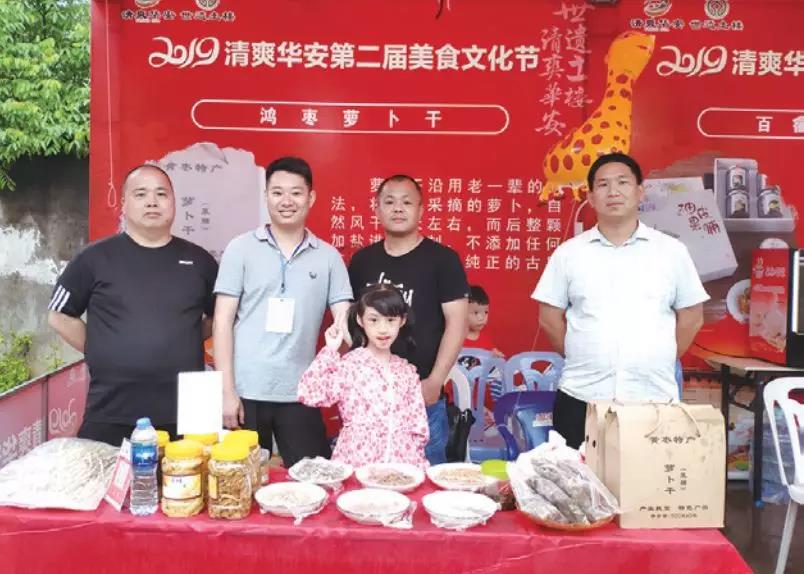 陈正平(左二)在华安第二届美食文化节上推介黄枣村的萝卜干