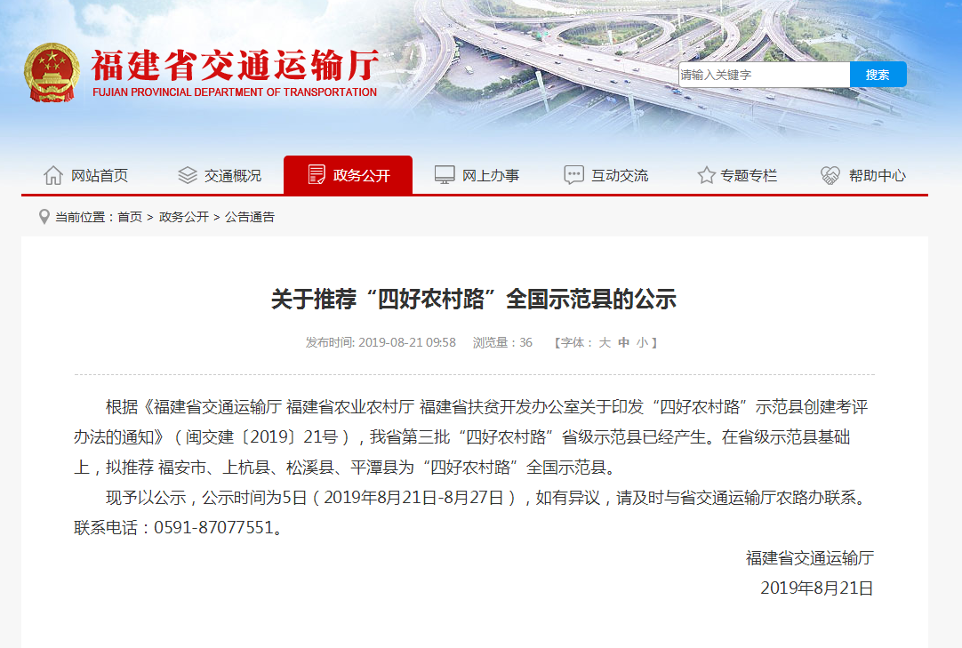 2019年8月21日,福建省交通运输厅发布《关于推荐“四好农村路”全国示范县的公示》。