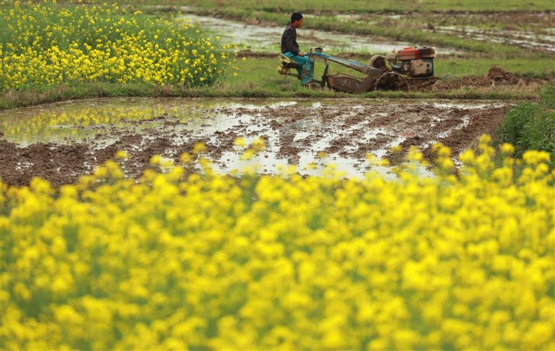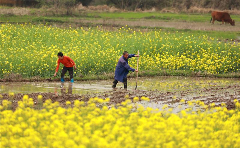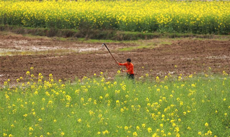 春暖花开时节,革命老区江西省吉安市泰和县10万多亩油菜花竞相绽放,乡村田园花香四溢。广大农民在做好新冠肺炎疫情防控的基础上,抢抓农时开展春耕生产,黄灿灿的油菜花田与农民辛勤劳作的身影相映成趣,描绘出一幅春意盎然的春耕图景。图为2020年3月11日,江西省吉安市泰和县马市镇两塘村农民在油菜花田间劳作。