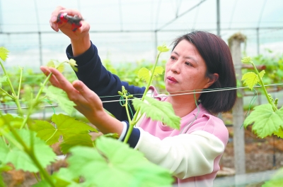 11日,毛富枝在政和县星溪乡东峰大棚阳光玫瑰葡萄种植标准化示范基地修剪葡萄枝条。