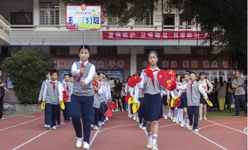 运动会入场仪式,身为班长的作者蔡林翰举着班牌:五年(5)班。