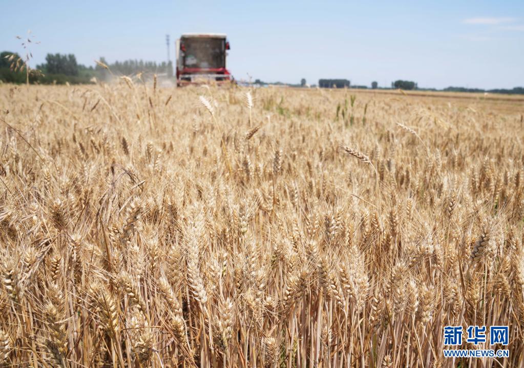 6月22日,联合收割机在河北省唐山市滦南县长凝镇方泡村田间收割小麦。新华社 杨世尧 摄