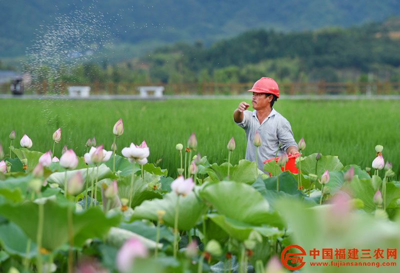 村民在武夷山市五夫镇万亩荷塘里劳作