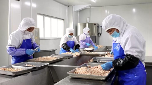 来到止马镇新振肉制品加工厂车间内,几十名工人正熟练的切肉、串肉、称重打包。据了解,目前在新振肉制品厂上班的工人,基本都是止马镇附近因缺乏技能或是受年龄限制等原因无法就业,只能在家里照顾小孩以及老人的中年妇女。因加工厂对工人的技术要求不高,门槛也低,劳动报酬按照时薪加计件的形式,让村民在家门口就能够实现轻松就业。