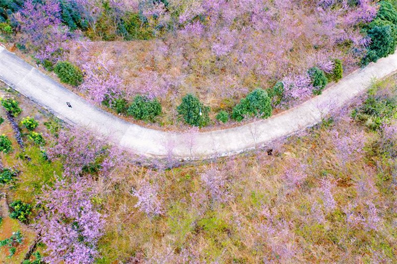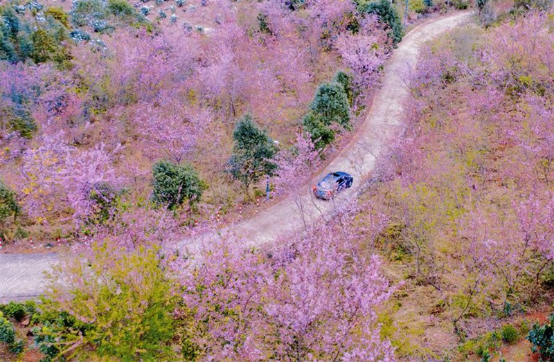 近日,福建省漳州市云霄县白石村的山樱迎春绽放,一个个花骨朵尽情舒展,争相惹眼。高空俯瞰,一树树樱花连绵成一道似锦云霞,仿佛为大地披上一袭“花衣裳”。