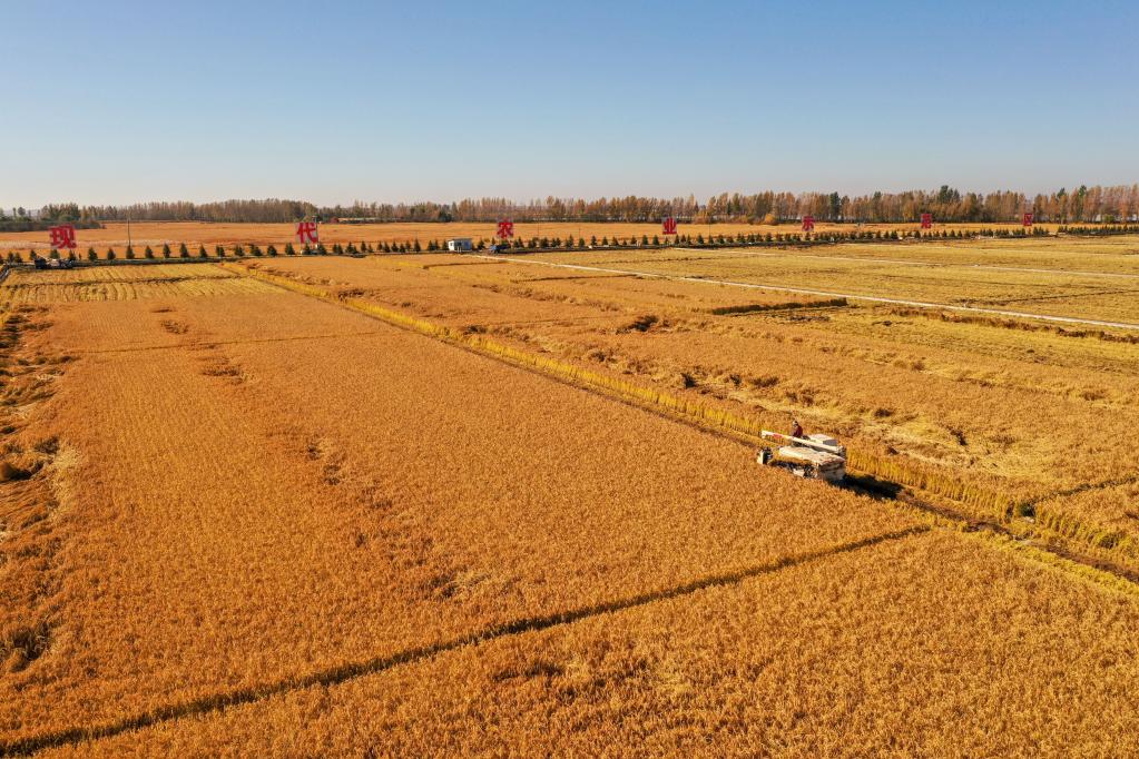 2021年10月12日,在吉林省吉林市永吉县万昌镇,农民驾驶农机收割水稻(无人机照片)。新华社 张楠 摄