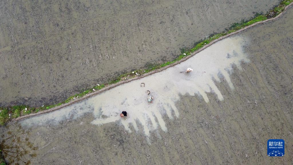 3月24日,在福建武夷山市五夫镇,莲农在莲田里劳作(无人机照片)。新华社发(陈颖摄)