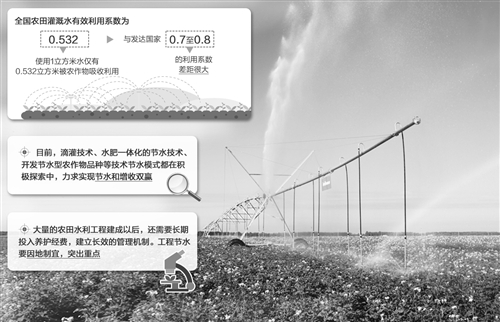 “各区域的水资源条件、地形地貌和主要农作物品种都不相同,工程节水要因地制宜,突出重点。”中国灌溉排水发展中心副主任闫冠宇说,水利部组织编制的《全国现代灌溉发展规划》明确将分区域建立与农产品生产定位相匹配的节水灌溉发展布局。同时,低压管道输水等节水工程的效果明显,但节水还有很多其他方式。如果土地比较平整,就可以减少灌溉水量、提高灌溉均匀度。目前,已有激光控制平地技术在国内外应用,在不搞节水工程的情况下,可以实现节水10%到15%。