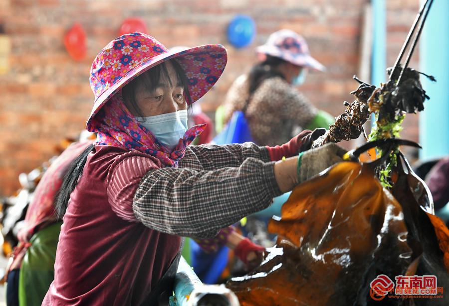 4月14日,在泉州市泉港区鸿兴海藻专业合作社内,工人忙着将海带从绳索上割下来。洪坤泽 摄