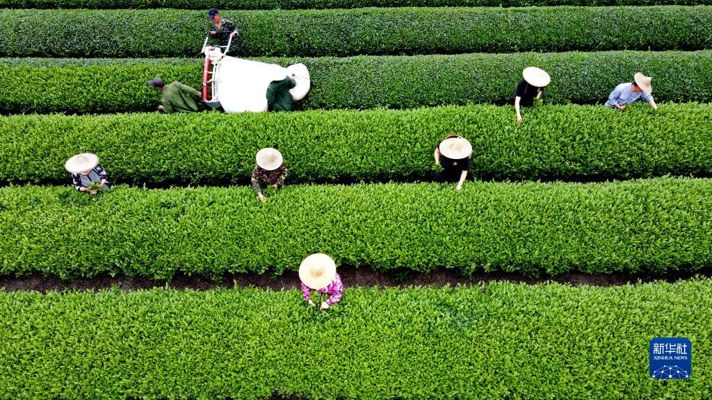4月15日,茶农在武夷山市星村镇的茶山上采摘新茶(无人机照片)。新华社发(陈颖 摄)