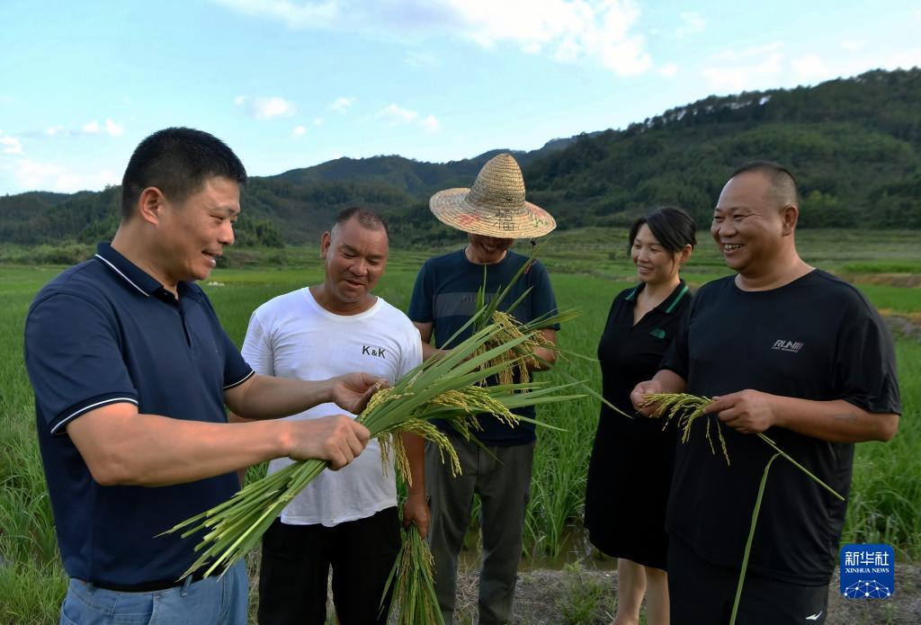 在福建南平市延平区南山镇,科技特派员陈钟佃(左一)向当地农民讲解水稻种植相关技术(8月3日摄)。新华社记者 魏培全 摄