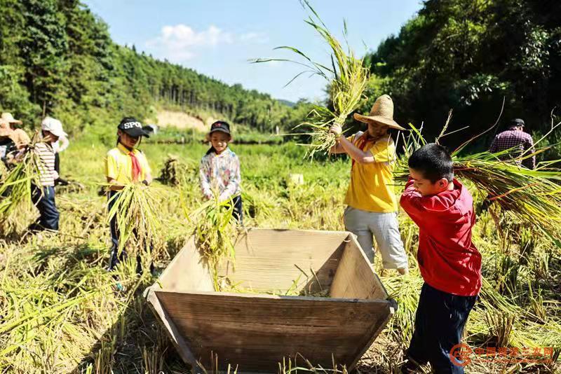 小学生们异常兴奋,个个卷起裤脚,踏入田间,挥动镰刀,收割稻谷,把稻谷放进打谷桶……金色的稻浪,饱满的谷穗,在阳光下分外耀眼。