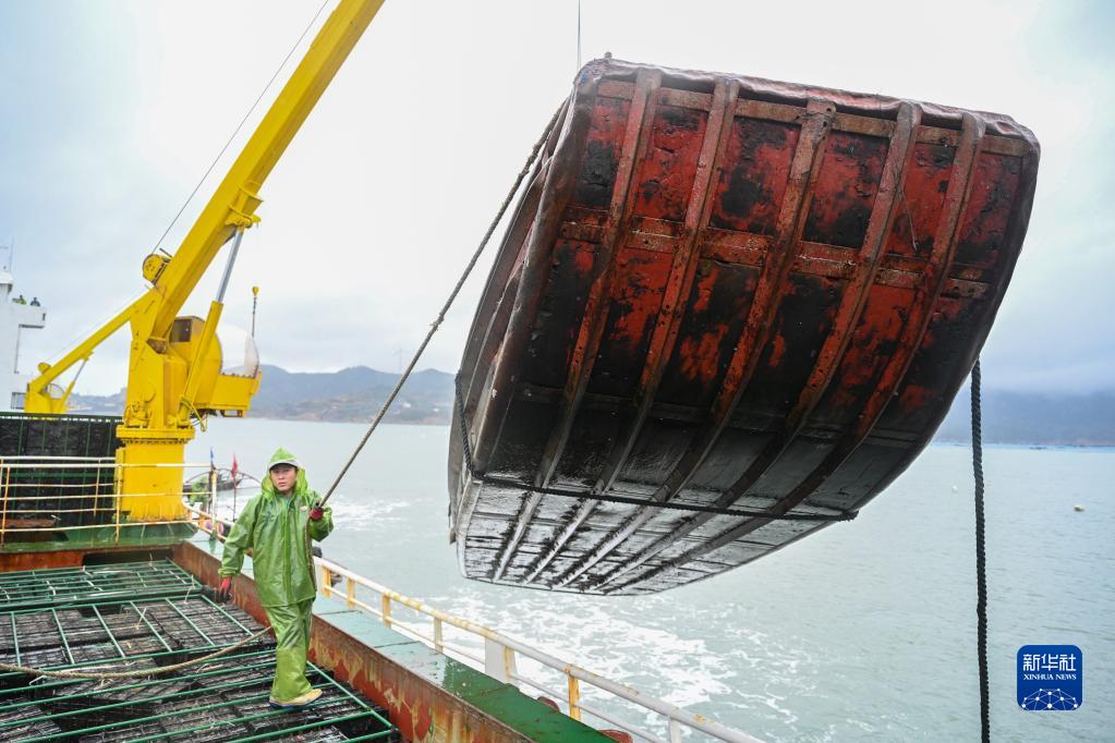 当日,福建福州连江县苔菉镇后湾海域热闹非凡,5万多笼鲍鱼从山东荣成乘船归来,返回家乡过冬。