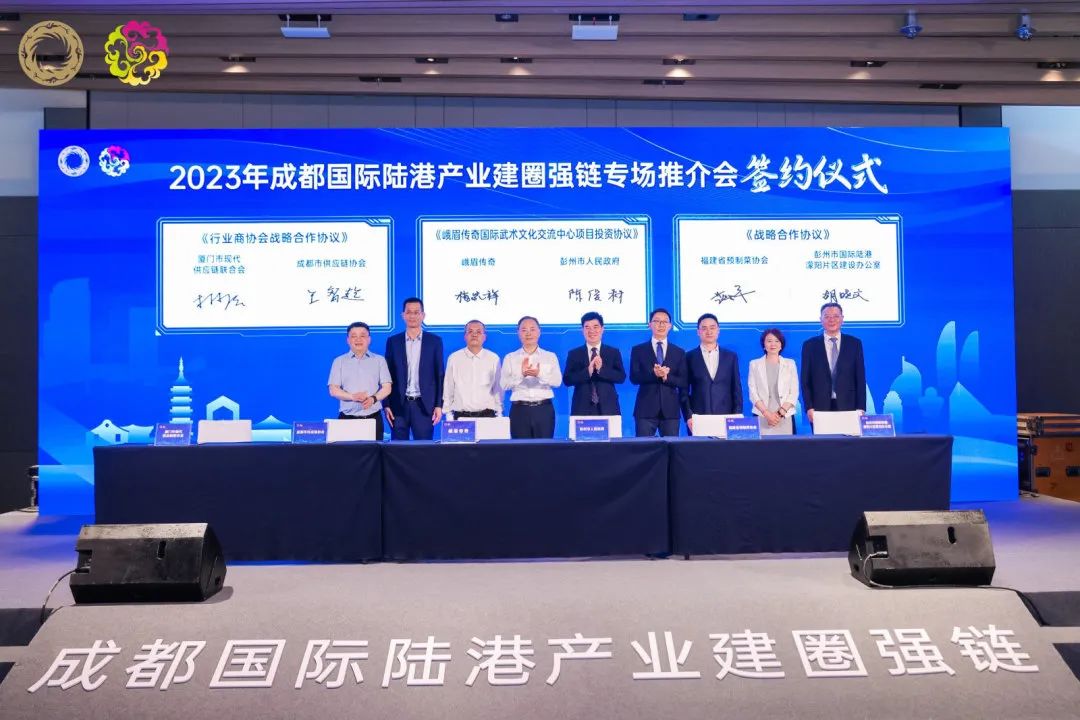 此次推介会上,彭州积极联动青白江组团“走出去”,让“陆港”牵手“海港”,与厦门市现代供应链联合会、福建省预制菜协会等签订合作协议,落地峨眉传奇国际武术文化交流中心等项目。其中,福建省预制菜协会与彭州市陆港办签订战略合作协议,双方将从战略咨询、活动会议举办、企业招商引资、学习培训等方面开展合作。
