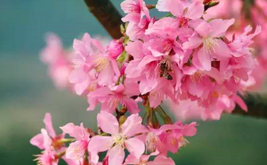 在园区内,一大片漂亮动人的绯红色的山樱花格外引人瞩目,整株无叶的樱花树上垂吊着一串串、一簇簇绯红色的吊钟小花,每朵花都轻柔的向下垂放,小鸟在花间嬉戏,让人禁不住停下脚步多看几眼,在花树下享受难得的悠闲与浪漫。